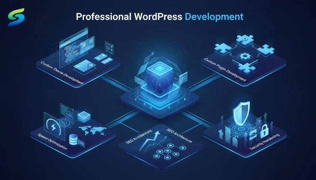 Development goes deeper than building. When we talk about developing a WordPress site professionally, we’re talking about custom code, performance engineering, and technical architecture — not just picking a theme and filling in content. Professional WordPress development involves:
